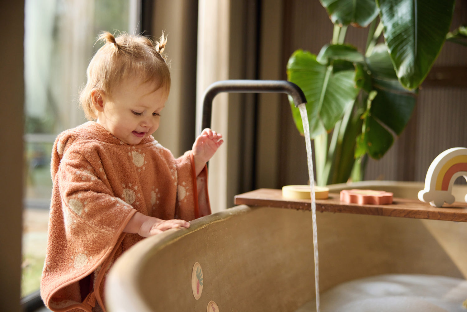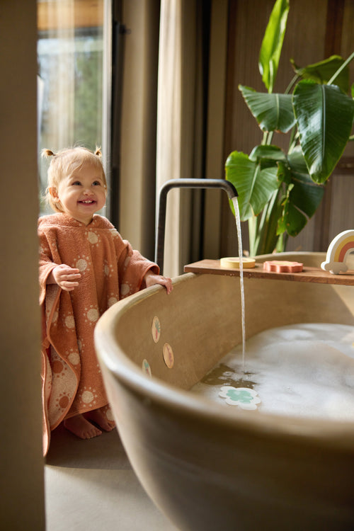 This bath poncho is perfect after a bath or a fun day in the water! Made from soft terry cloth, it quickly absorbs moisture. The cute little hood keeps your child’s head nice and warm, while the reversed colors on the inside and outside give the poncho a playful touch. The snap button on the side keeps it securely in place, even when your little one is walking or playing. Ideal for use at home, but also super handy to take along to the beach or pool!