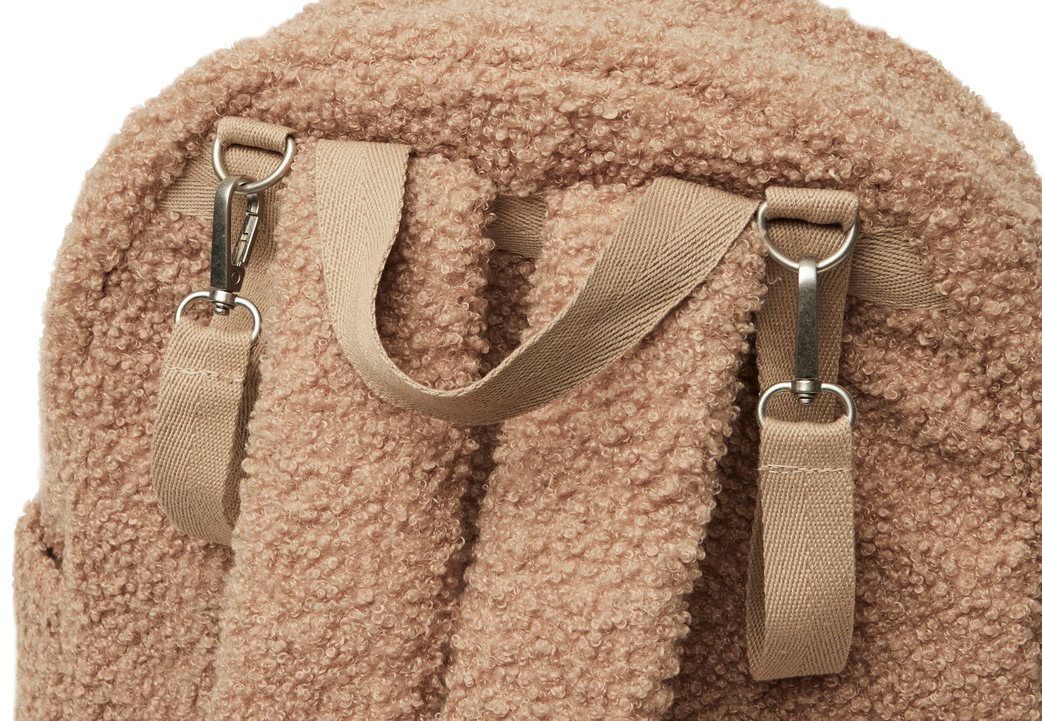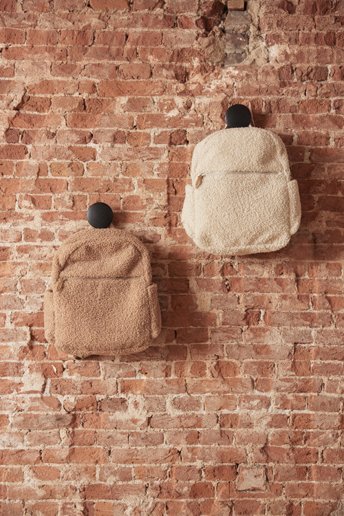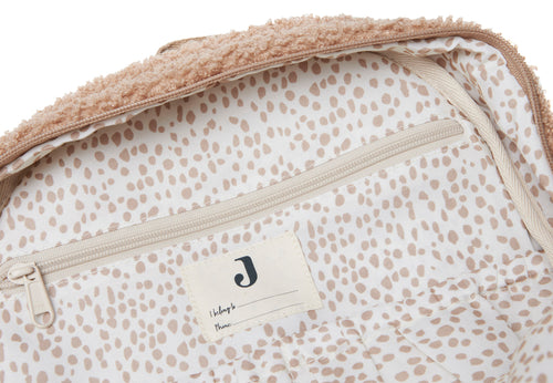 Boucle, it's soft, pettable and super trendy. This fun theme includes a backpack, a pouch and a changing mat. All practical items, all modern must-haves. The theme is available in the colours biscuit and naturel, and can be easily combined with all kinds of colours and prints.