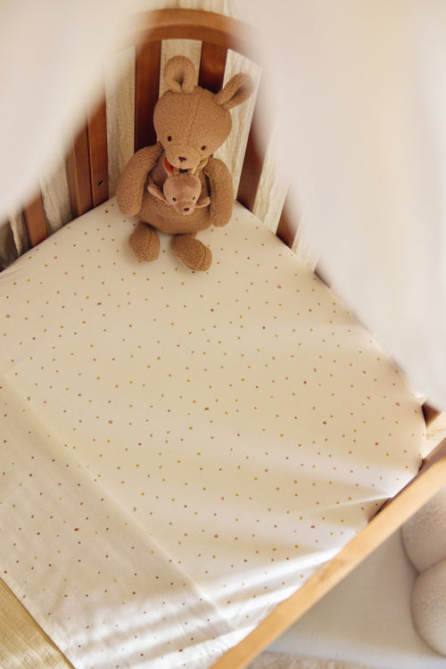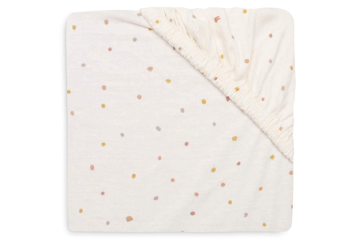 This adorable fitted sheet ensures your little one sleeps softly and comfortably. Made from jersey fabric, it feels smooth, is breathable, and stretches easily. The elastic edges keep the sheet neatly in place, even when your baby moves around at night. That way, the bed stays nicely fitted, without any extra effort from you. The playful print adds a cheerful touch to the crib without being too busy. Looking for something more subtle? Jollein also offers fitted sheets in uni colours.
