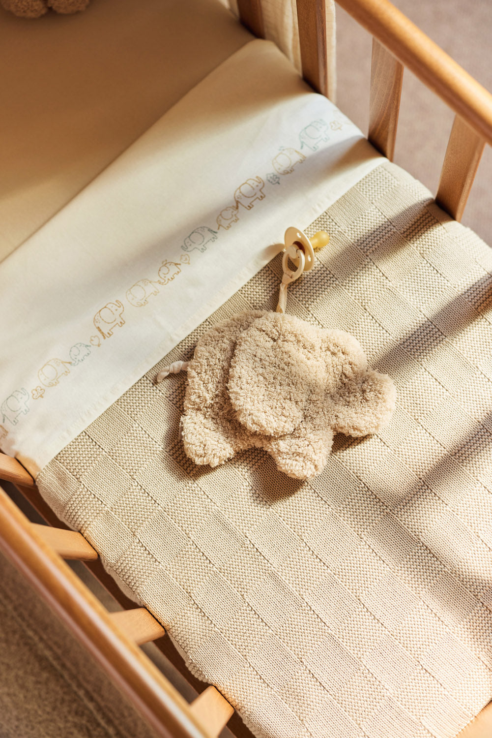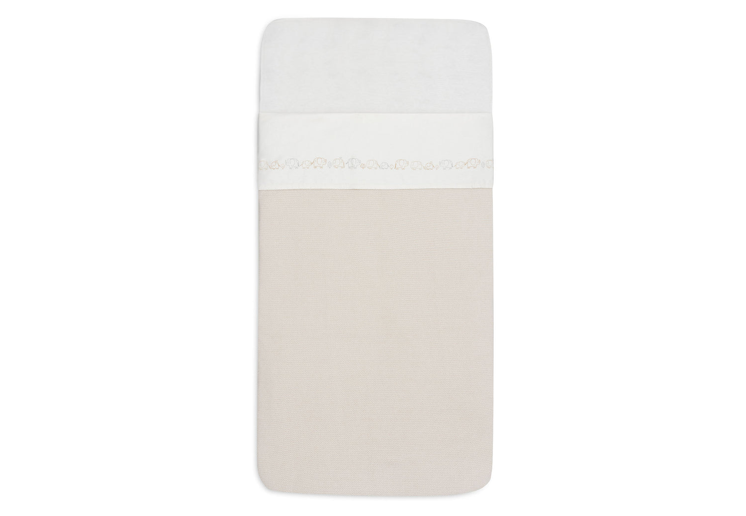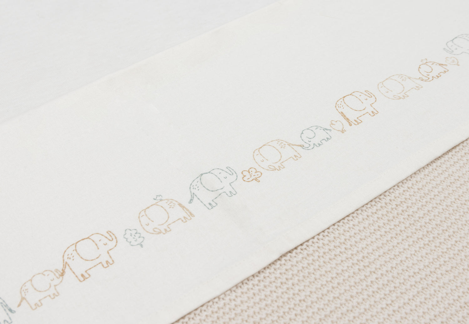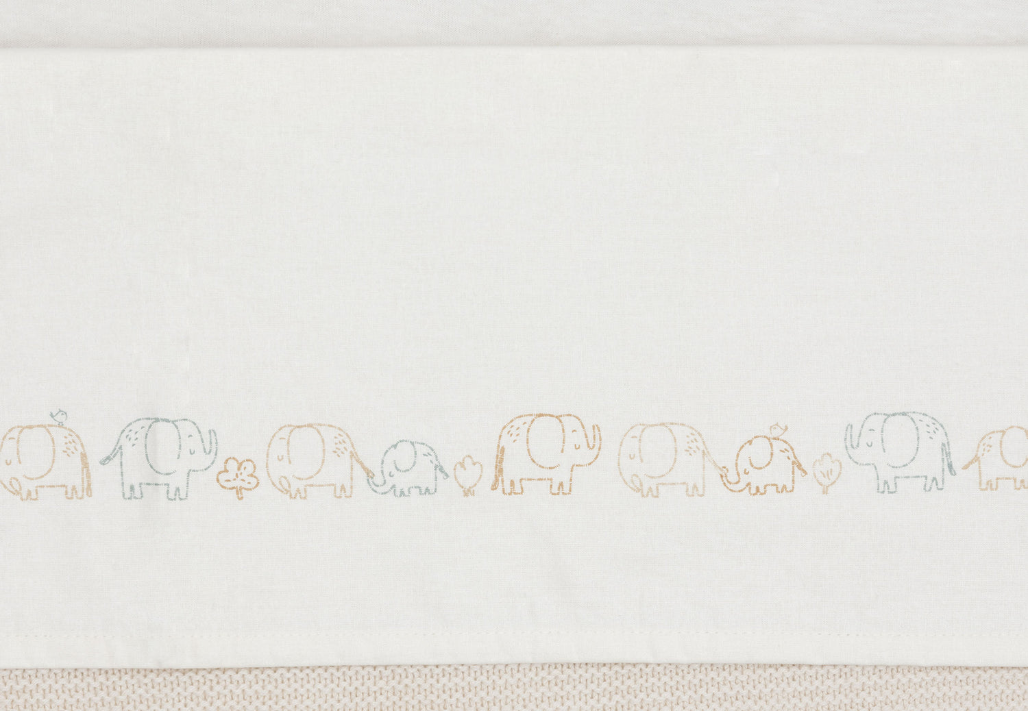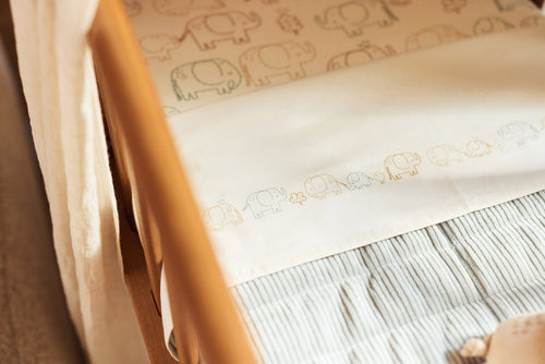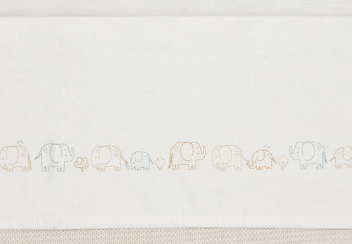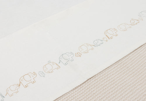 This sheet features a cute parade of elephants stretching along its full length. The elephants come in soft tones like Milky Coffee, Sea Green, and Biscuit, with an oatmeal background for a warm and calm look. Perfect for the nursery and a lovely match with the Elephant Tales collection!