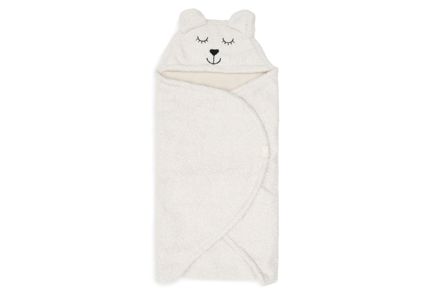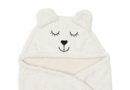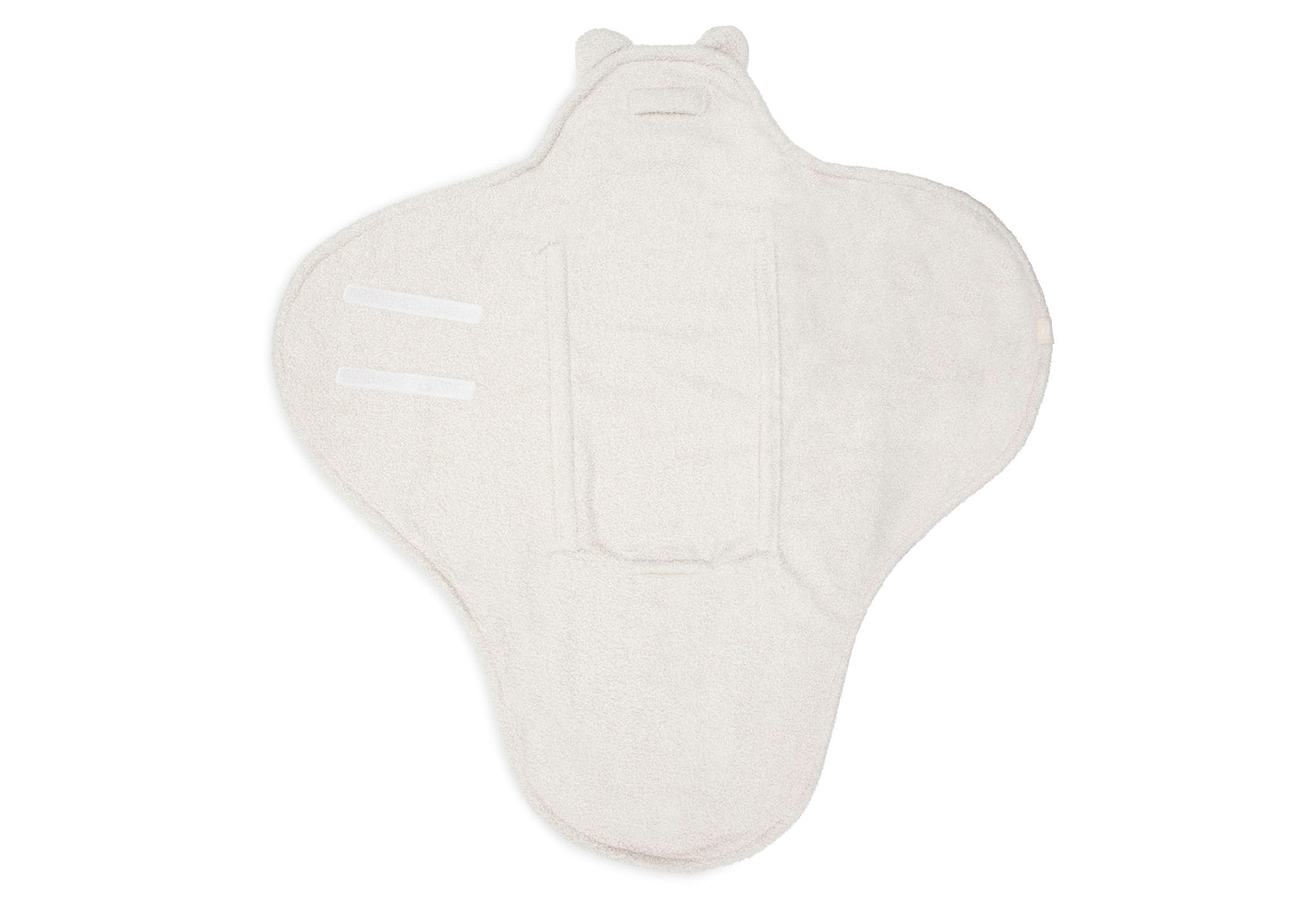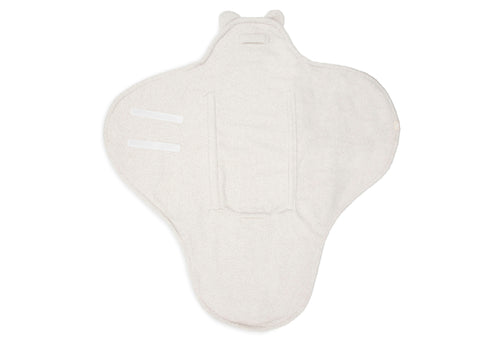 Wrap blanket with guaranteed mega cuteness factor. It has fluffy fur-look fabric on the outside, and it's super comfortably soft on the inside. Wrap your baby up and close the blanket with the practical velcro strips. Put the little hat on, with adorable little ears and a little bear face. Too cute! This wrap blanket can be used from birth. And it's also practical to use in your baby's first car seat. You can put the belts of the car seat through the openings in the blanket, so your baby can stay in their wrap. It's a universal wrap blanket for the Maxi Cosi and every other brand of category 0 cat seat with three or five point seatbelts. Available in various colours.