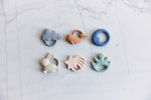 Deze bijtring kan je baby lekker in zijn mond stoppen om er op te sabbelen en te bijten. Bij doorkomende tandjes kan het extra fijn zijn om de bijtring voor gebruik in de koelkast te leggen (nóóit in de vriezer). De koude bijtring verdooft het vervelende gevoel op het tandvlees een beetje. Deze bijtring is verkrijgbaar in zes verschillende vormen. Elke vorm heeft zijn eigen kleur. Voor je baby is elke vorm makkelijk te grijpen en vast te houden. Doorkomende tandjes kunnen er voor zorgen dat je baby zich minder lekker voelt. Ook niet zo gek natuurlijk: de tand wurmt zich een weg door het tandvlees en dat doet zeer of het geeft jeuk. Vaak zie je het ook wel in het mondje: een harde bobbel en rood of gezwollen tandvlees. Het is hard werken voor jouw baby! Om de pijn iets te verzachten is het voor jouw kleintje fijn om ergens op te bijten. Dat verlicht de druk op het tandvlees bij de doorkomende tandjes. Deze bijtring van natuurlijk rubber kun je gebruiken bij alle leeftijden en is veilig voor jouw baby vanaf 0 maanden.