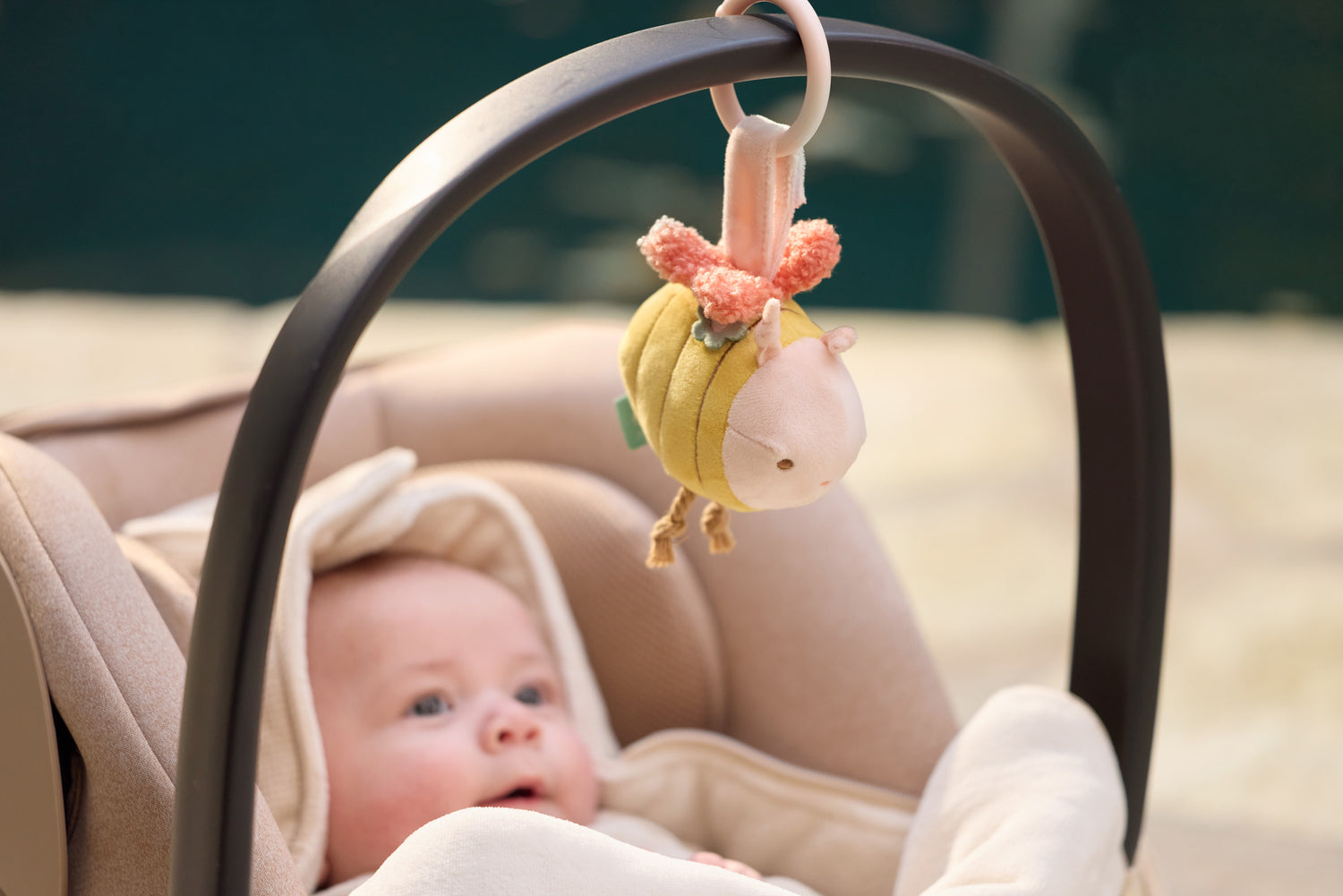 Hoe lief is deze wagenhanger uit het Pretty Picnic thema! Het schattige bijtje heeft speelse details en een geborduurd gezichtje. Binnenin zit knisperpapier en ook een klein belletje verstopt, waardoor het bijtje nóg leuker wordt om mee te spelen. Dankzij de handige ring bevestig je hem gemakkelijk aan de kinderwagen, zodat je kleintje onderweg altijd iets leuks te ontdekken heeft.