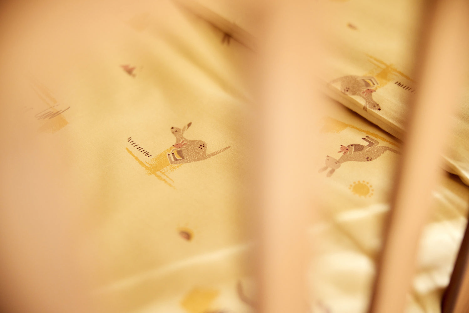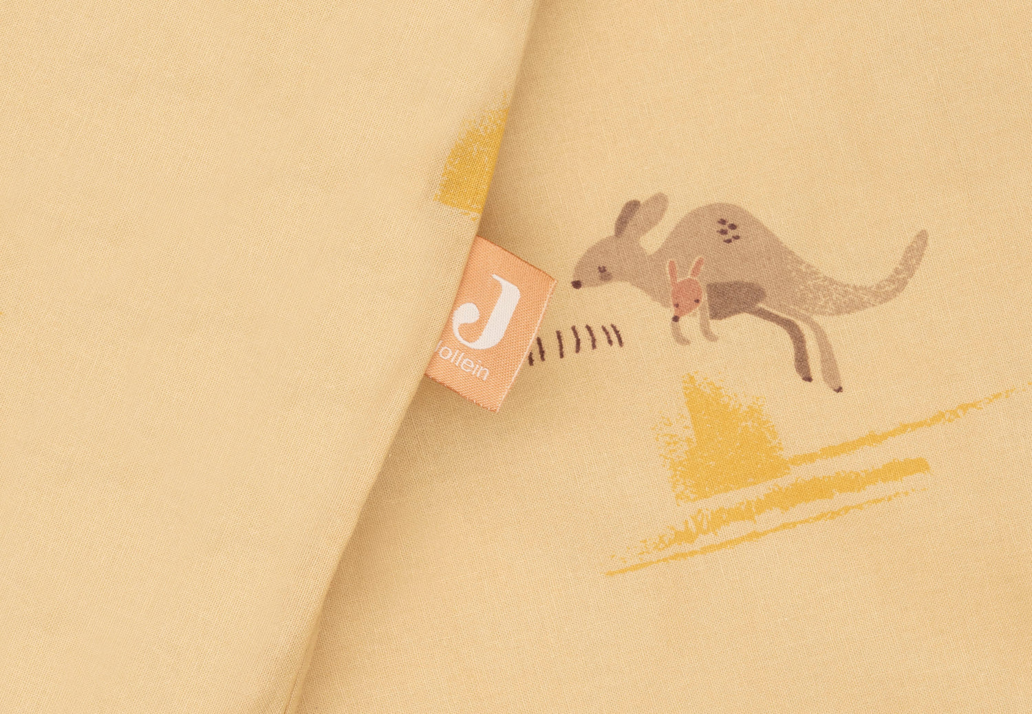 Dieses Bettwäscheset bringt ein Gefühl von Geborgenheit ins Kinderzimmer. Der Allover-Print mit Kängurus und ihren Jungen im Beutel strahlt Wärme und Verbundenheit aus, während der sanfte Vanilleton für Ruhe sorgt. Die Bettwäsche besteht aus Baumwolle und fühlt sich leicht und angenehm an, sodass Ihr Kind erholsam schlafen kann. Sowohl der Bettbezug als auch der passende Kissenbezug sind auf beiden Seiten mit demselben süßen Print versehen.