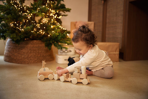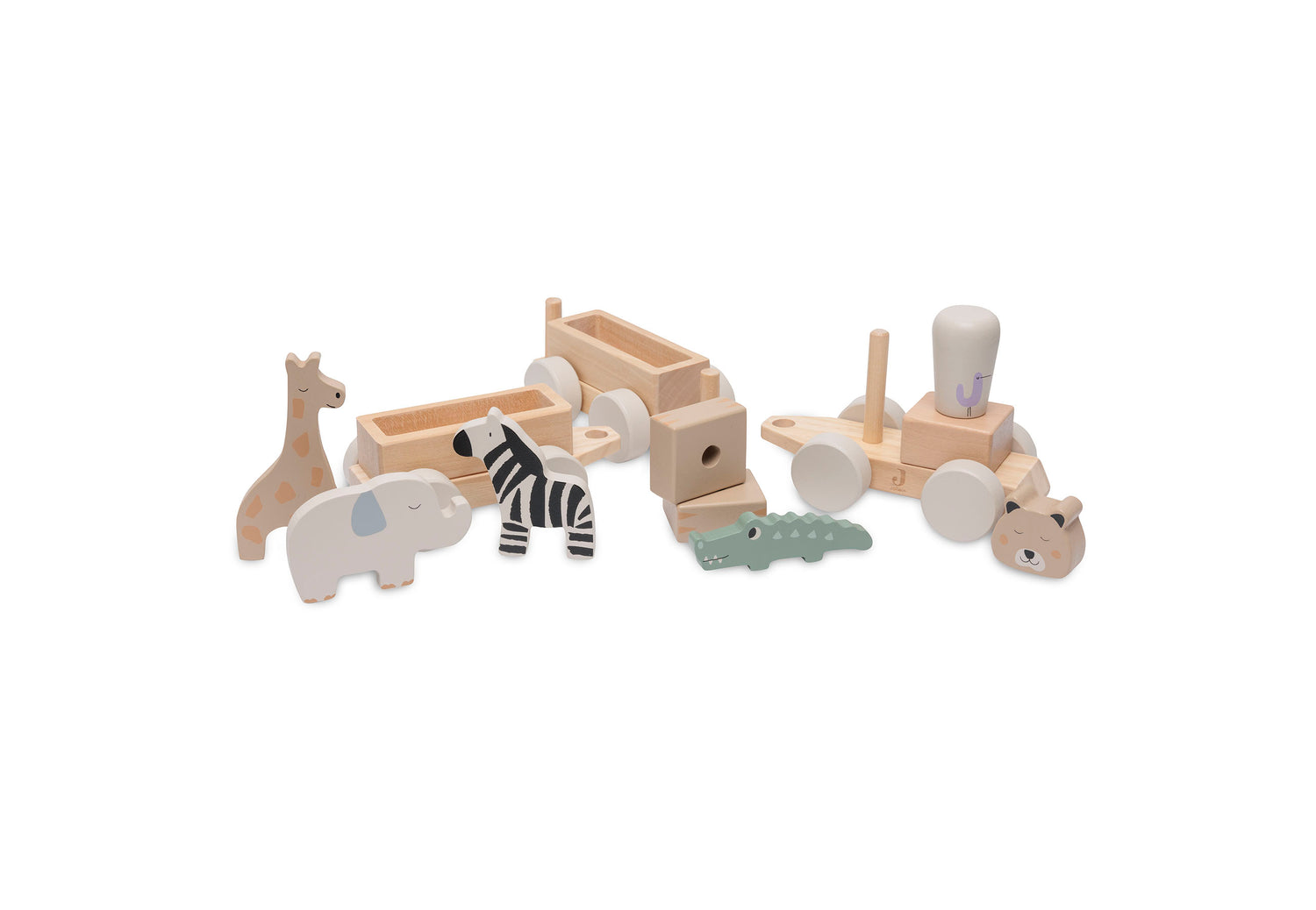 Eine Holzeisenbahn ist ein echter Klassiker. Nichts macht so viel Spaß wie das Beladen von Waggons und mit dem Zug herumzufahren. Räder, Lenkung und Bremsen: ein großartiger Lernprozess für die Kleinen. Dieser Zug im Dschungel-Thema kommt mit allerlei Tierarten, die gerne transportiert werden: ein Krokodil, eine Giraffe, ein Elefant, ein Zebra und ein Gepard bilden das Publikum. Damit kann sich dein Kind stundenlang beschäftigen.