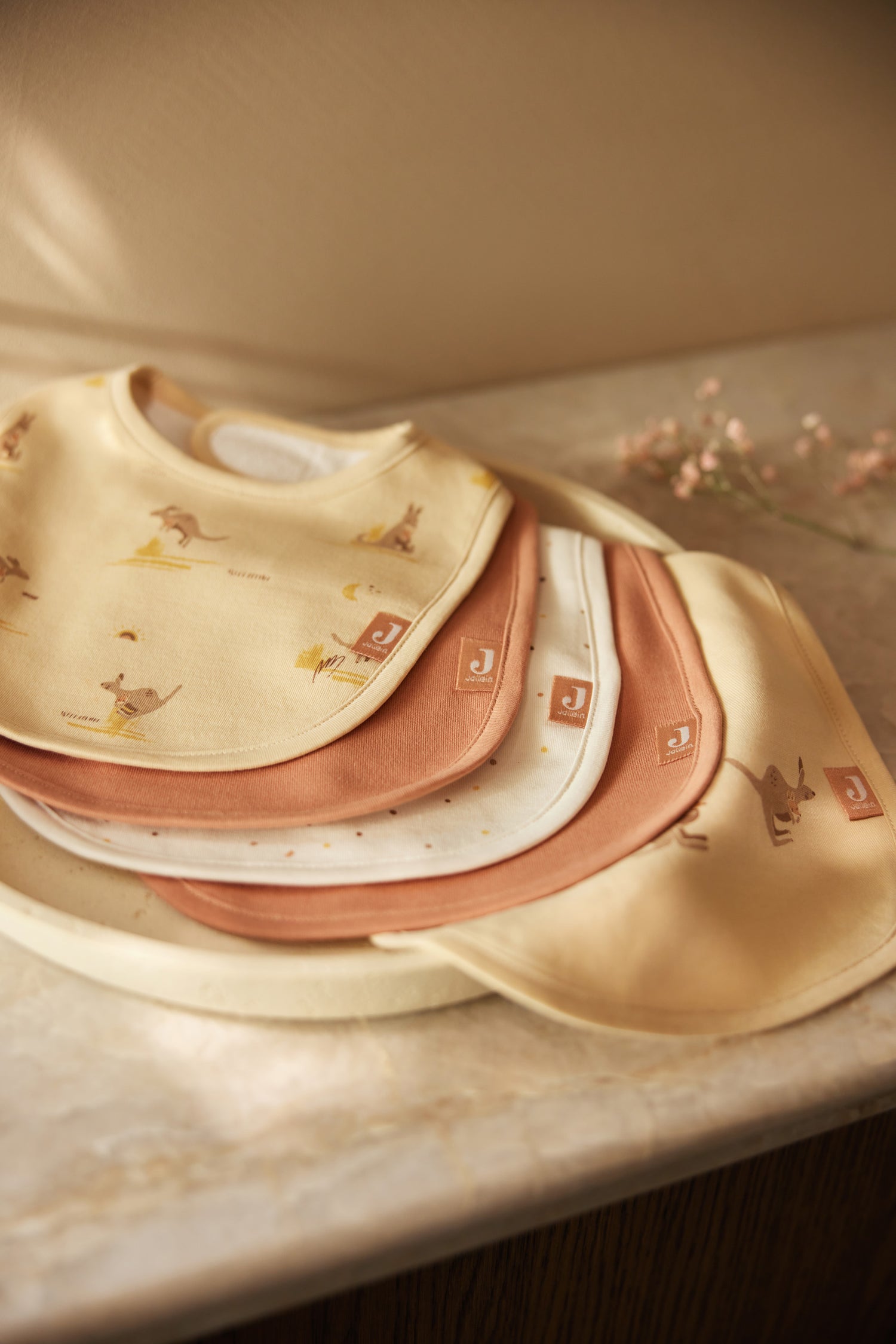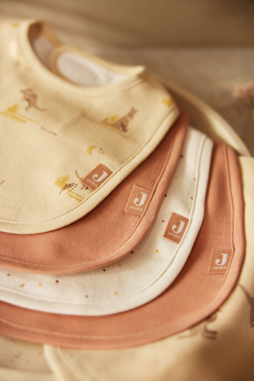 Das Set umfasst fünf Lätzchen in schönen, trendigen Farben – jedes mit einem eigenen, liebevollen Muster.