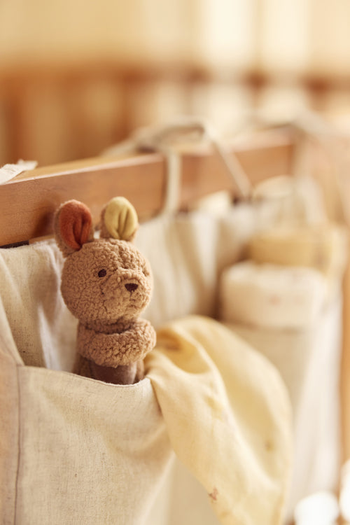 Wie süß ist diese kleine Kangaroots Rassel! Das weiche Coral Fleece und Samt machen sie angenehm zum Greifen, während die zwei unterschiedlich gefärbten Ohren ein verspieltes Detail hinzufügen. Innen befindet sich eine kleine Glocke, die bei jeder Bewegung leise klingelt. So macht das Spielen noch mehr Spaß und sie ist gleichzeitig ein liebes Kuscheltier zum Greifen.